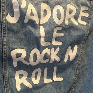 Forever 21 Jacket, Denim Trucker Jacket, J'adore Le Rock N Roll, Distressed Jean Jacket, Graphic Denim, French Slogan, Rockstar Aesthetic, Edgy Fashion, Concert Outfit, Blue Jean Jacket Large