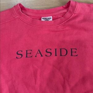 Comfortable crewneck sweatshirt in coral with 'SEASIDE' chest print. Soft, durable fabric for everyday wear. Relaxed fit and ribbed cuffs for easy layering. Coral color adds a vibrant touch to casual outfits.