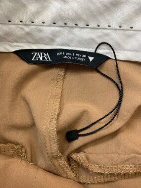 This Zara women’s Trouser Pants makes a statement due to it's pleated front, straight wide leg, high rise, zip fly with slide/button closure, full length, pockets, belt loops, faux back pockets and tan light brown shade.