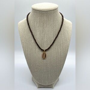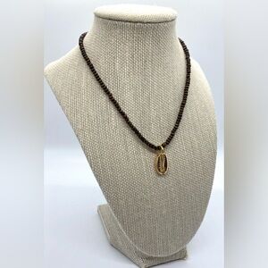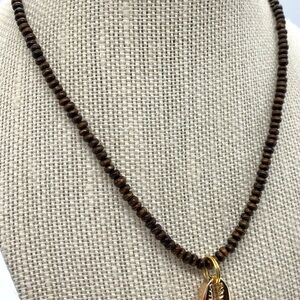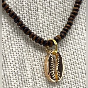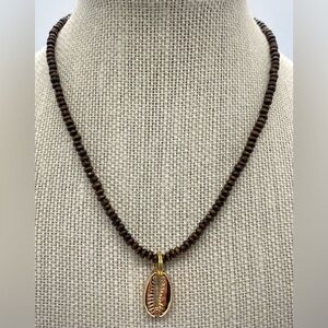 Brown Wood Beaded Necklace w/ Gold Seashell Charm Boho Y2K Preppy Festival