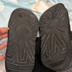 UGG mid-calf boots with knit upper and decorative button detailing. Fold-over cuff for versatile styling. Soft suede heel and cushioned sole for comfort. Easy slip-on design perfect for cooler weather.