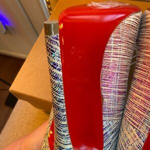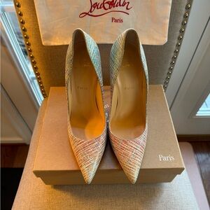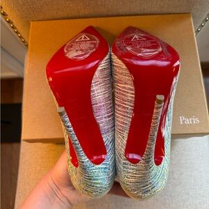These are GORGEOUS Christian Louboutin heels in a woven multicolor fabric, the Unicorn pattern. Size 42. Pointed toe and high stiletto silhouette. Signature red sole visible. Lightweight woven texture with a beautiful textured ✨ shimmer ✨ They are STUNNING. Unfortunately, I bought them thinking they were 100mm stiletto heels from the description. And once I received them, I realized that they were actually 120mm. And that’s just too high for me! However, I know they will be perfect for the right owner! 🩷