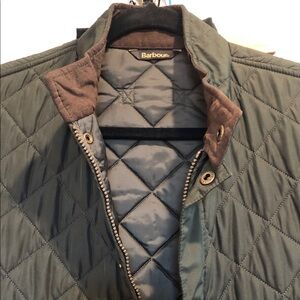 Classic Barbour quilted vest. Sleeveless design with snap-front closure and zip. Flap pockets with button details. Diamond quilt stitching throughout. Lightweight insulated layer for chilly days.
