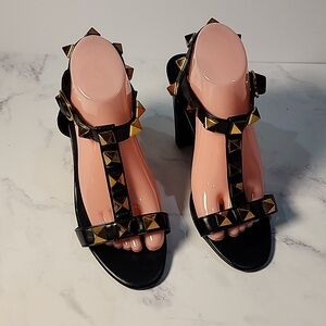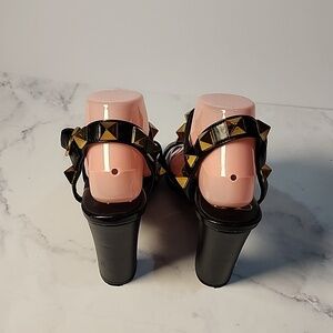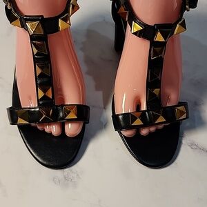 These black ankle-strap sandals are the Valentino Garavani Stud heels, featuring oversized gold-tone pyramid studs.