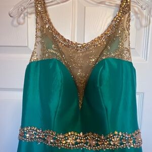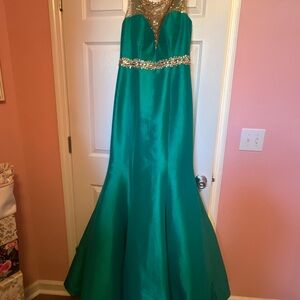Stunning emerald green prom dress with sparkling sequin bodice and jeweled waist. Fitted mermaid silhouette flatters the figure and flows into a dramatic skirt. Elegant sequin detailing adds glamorous sparkle for special occasions. Comfortable, eye-catching style in vibrant emerald green. Never been worn, never altered. Bought for a Holiday Gala, ended up not attending. It’s been safely stored in my closet ever sense.