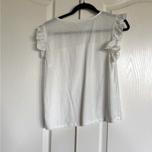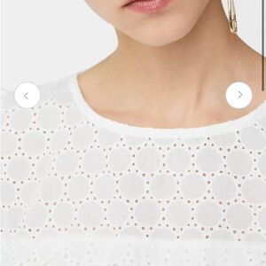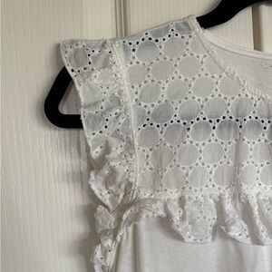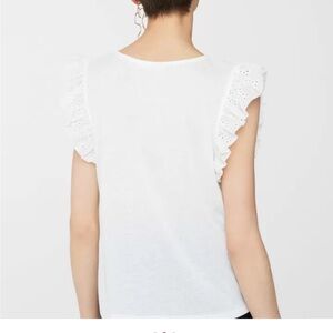 Mango Schiffli white embroidered eyelet top with round neck, ruffle across bust, ruffle, cap, sleeves, and loose bit through bottom.