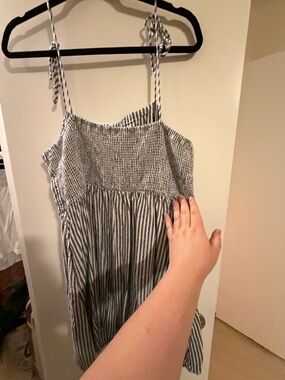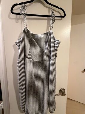 Old Navy light blue/white striped dress with tie straps and POCKETS! Smocked behind on the top half (pictured).