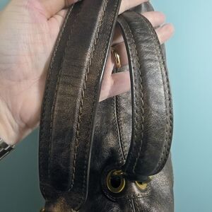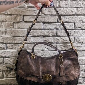 Coach shoulder bag in metallic brown leather. Features turn-lock front closure and top handle. Includes detachable strap with brass-tone hardware. Leather hang tag adds signature detail.