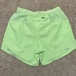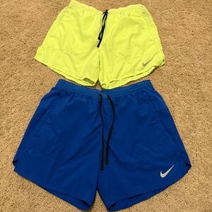 Nike Dri-FIT running shorts in solid blue and neon yellow. Elastic waistband with drawstring. Subtle reflective Swoosh logo. Lightweight fabric for workouts. Built in underwear.