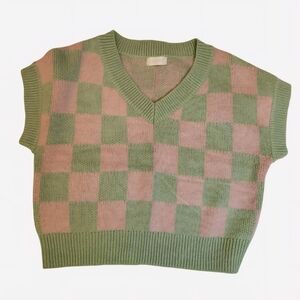 Altar'd State Pink & Light Green Checker V-Neck Sweater Vest