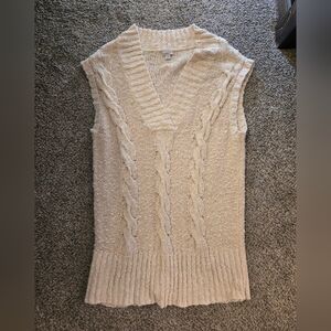 Cream cable-knit sleeveless sweater with a V-neck. Textured cable detailing down the front. Ribbed hem and neckline. Easy layering piece for casual looks.
