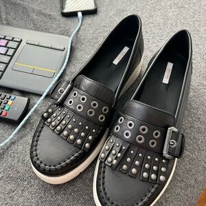 Black leather loafer sneakers with studded fringe and buckle detail. Slip-on style with comfortable cushioned.