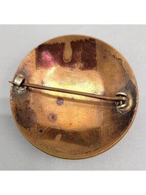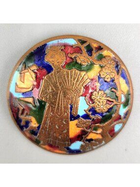 Antique Champleve Brooch Asian Geisha Enamel Copper Round Metal C Clasp