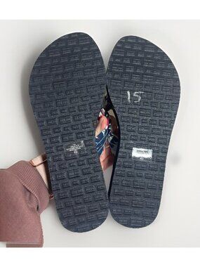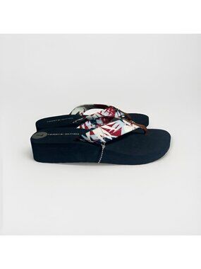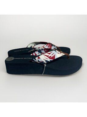 New Tommy Hilfiger blue wedge flip flop sandal with a blue, white and red floral print in women’s size 7. Navy blue slight wedge bottom has a foam like feel. Floral upper thong mad of a fabric material that feels water proof. No box or tag. New condition.