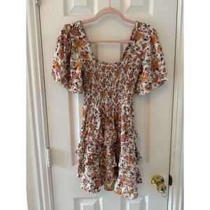 Beautiful Chelsea & Violet floral mini dress featuring a fully smocked bodice, romantic puff sleeves, and a tiered ruffle skirt. Lightweight rayon fabric with a soft ivory base and warm floral tones gives this dress an effortless boho/cottagecore feel—perfect for spring, summer, brunch, or vacation wear.
