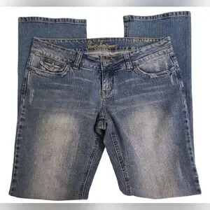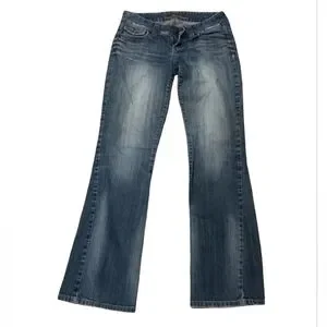 Women Classic blue bootcut jeans with a faded wash. Comfortable mid-rise fit and slight stretch for everyday wear. Versatile style that pairs easily with tops and boots. Color: blue. Size 28 x 31