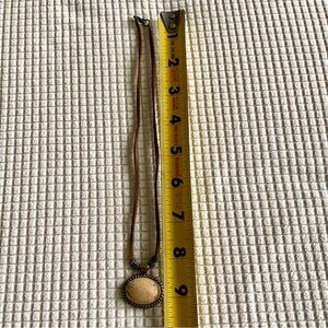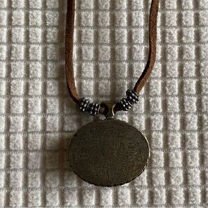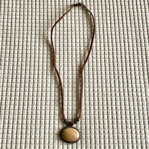 Jasper stone pendant necklace on a leather cord. The unique design and neutral color make it a versatile accessory for any occasion. Great for casual wear. Measures 18”.