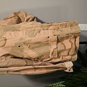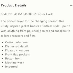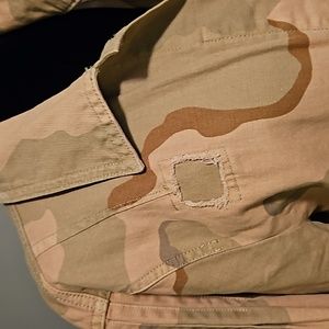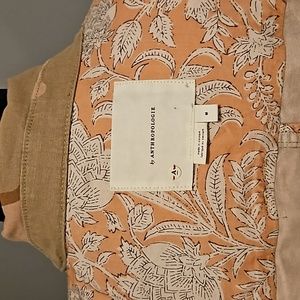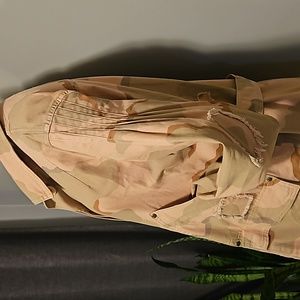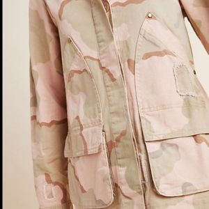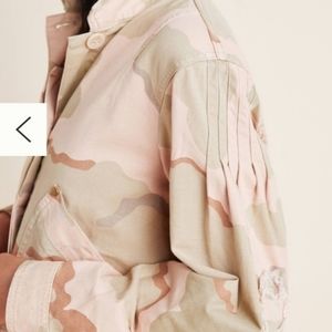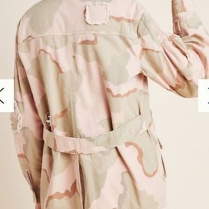 Chic, fun lightweight transition piece from boho fave anthropologie. Muted pastel colors in trendy camo pattern. 4 large pockets, belted back, contrast floral cuffs, & delightful pleated sleeves that Bell out at elbow.