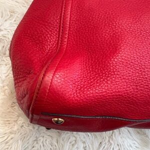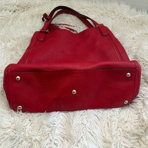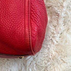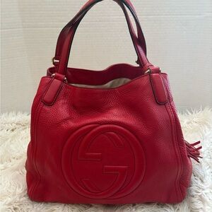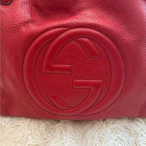 This handbag is the Gucci Soho Medium Shoulder Bag in red pebble leather. It is a signature piece from the Gucci Soho collection, characterized by the bold, embossed interlocking GG logo on the front.