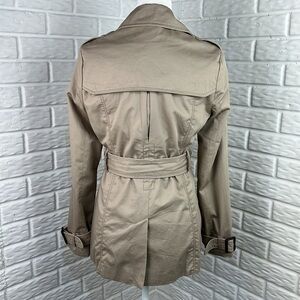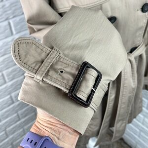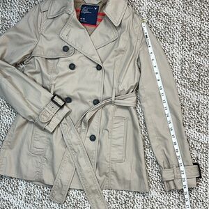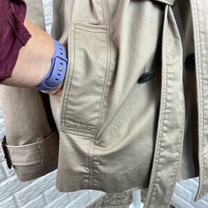 Excellent condition with no flaws on this trench coat from American Eagle. Nice deep pockets on the front. Double button closure with belt. Buckle adjustable at the wrist. Cotton stripe lining with satin polyester lining in the sleeves. Women’s size medium.