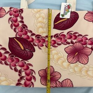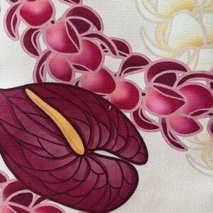 with vibrant pink and burgundy hibiscus and lei print.