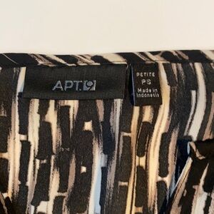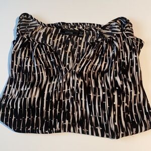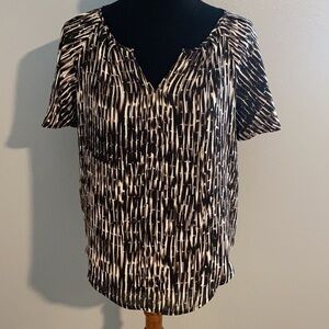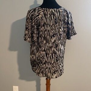 Great condition, Vertical striped, black brown cream, almost animal print like blouse. Size petite small but fits more liked medium. 100% polyester. Measures 40” around at bust.