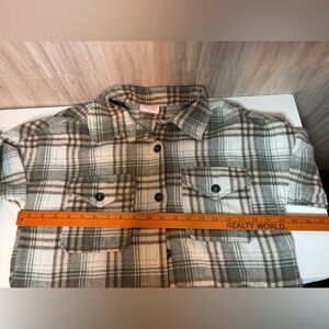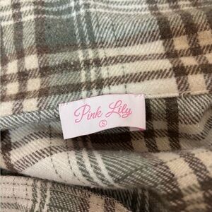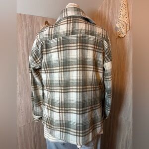 Chic plaid utility jacket by Pink Lily. Features green and tan tones. Ideal for layering. In great condition. See pics for measurements. 100% polyester.