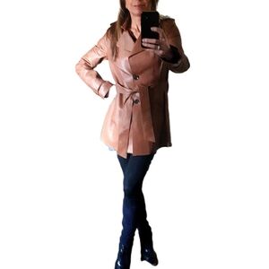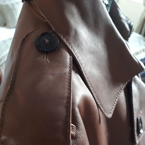 Banana Republic heritage leather brown 3/4 classic trench with two front pockets detailed with a leather edging and strap detail at sleeves, shoulders and the back of the.collar detailed with buttons. Super soft lamb leather. Worn only a couple of times. Pristine.
