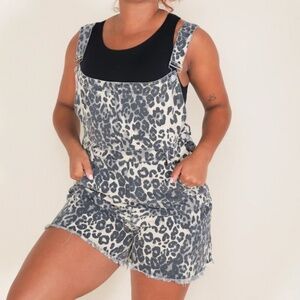 Stand out in this trendy Molly Green Jesse Cheetah Print Overall Romper, crafted from sturdy cotton denim with adjustable buckle straps and raw hem detail. The neutral tan and black animal print gives it a bold, modern twist — perfect for pairing with a simple tank or long sleeve tee for a casual, elevated look.