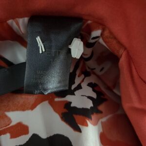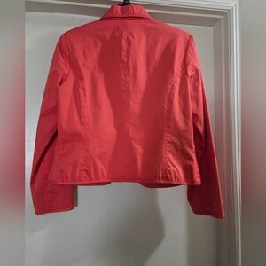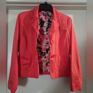 Cropped tailored blazer with two front patch pockets. Button-front closure and rounded notch collar. Smooth woven fabric with light structure. Floral-print lining at interior for a subtle contrast.