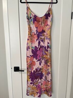 Silky slip maxi dress with bold floral print. Vivid purple blooms and coral-pink petals cover a soft pink base. Thin adjustable spaghetti straps. Sleek, flowing silhouette for easy wear. Ideal for brunch or summer evenings.