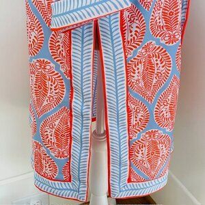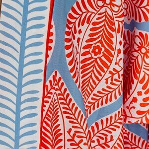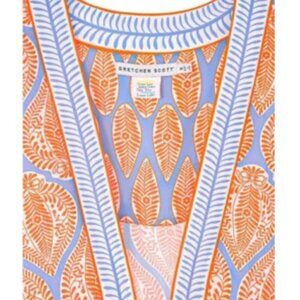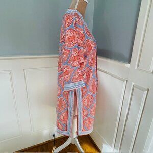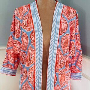 Blue, White & Orange Preppy Cover up/ Duster Jacket. Gretchen Scott Polyester Crepe Open Front, Side Slit Cover Up Jacket. Silky flowy jacket with elbow length wide sleeve with contrasting pattern cuff with slit. Large side slits trimmed with contrasting pattern. Great as a cover up at the pool/beach/cruise or equally at home as a topper over white pants/jeans. Relaxed fit casual preppy topper jacket.