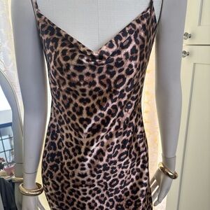 NWT Sleek leopard print slip dress in brown and cream. Lightweight, silky fabric with adjustable spaghetti straps. Flattering cowl neckline and side slit for easy movement. Perfect for evening events or styled casually. Available in brown/cream leopard pattern.