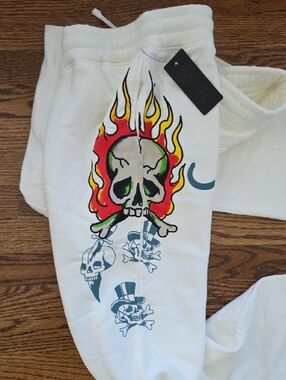Soft white/ivory wide leg sweat pants with bold flame skull graphic on the thigh. Elastic waistband with drawstring for a secure fit. Relaxed, casual silhouette for everyday wear. Eye-catching multi-color artwork accents along the leg.