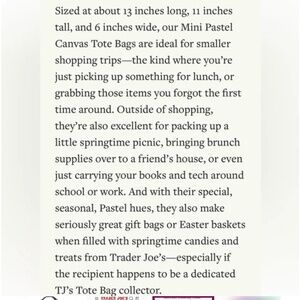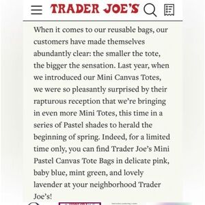 Part of the newest pastel Trader Joe’s mini tote collection.