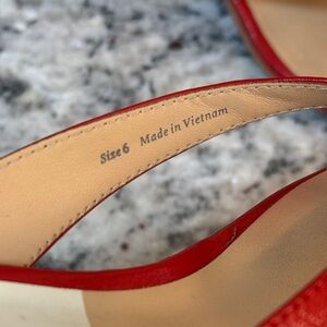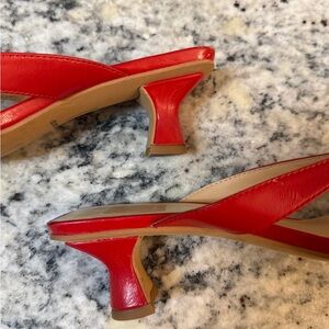 Sleek red sandals with thin crossover straps. Square toe silhouette with low kitten heel. Smooth finish for a polished look. Easy to pair with dresses or jeans.