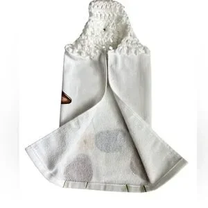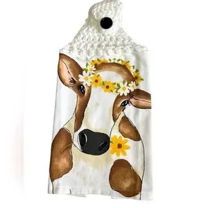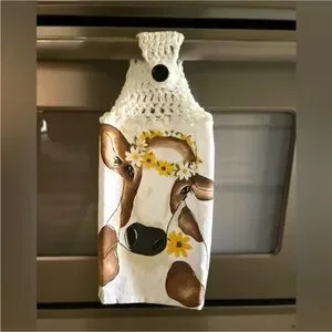 Charming kitchen towel with a cow design. Features crochet top with button. Perfect for adding a rustic touch.