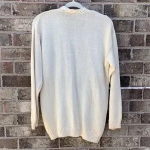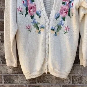 Cream knit cardigan with embroidered floral panels. V-neck silhouette with front button closure. Lightweight and easy to layer. Feminine multicolor floral detail at front.