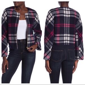 The design is a cropped, collarless "lady jacket" style with a gold-tone front zipper, ribbed hem, and front slip pockets. A Classic bomber silhouette in a navy plaid wool. Features bold pink and white plaid lines. Zip-front closure and clean, cropped hem. Versatile piece that layers easily.