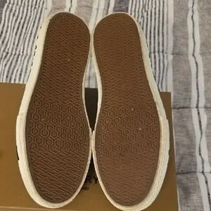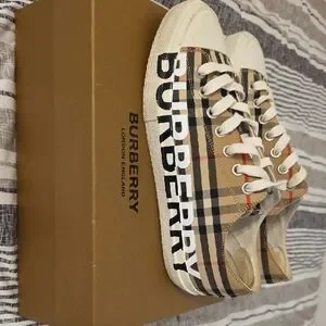 Burberry low-top canvas sneakers. Black and white striped upper. White rubber toe and laces. Signature side logo detail.