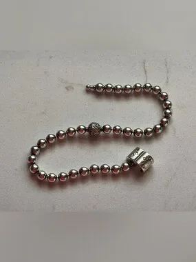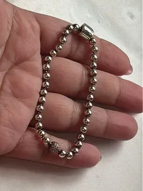 Elegant solid sterling silver beaded Pandora bracelet with a sparkling zirconia pave accent bead. Designed for versatile everyday wear. The silver finish adds a polished, modern touch. Small size. Preowned but in good condition.