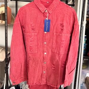 Oversized distressed denim jacket in a washed pink tone. Front patch pockets and button-front closure. Raw hem and subtle ripped detailing. Layer over tees for a relaxed look.
