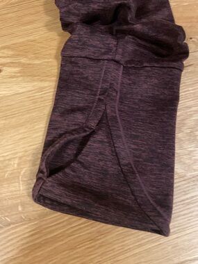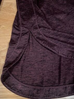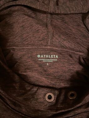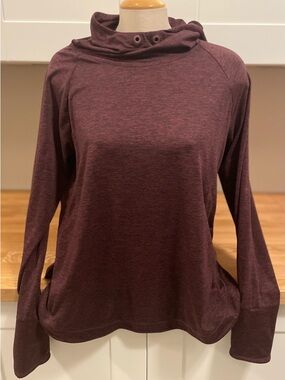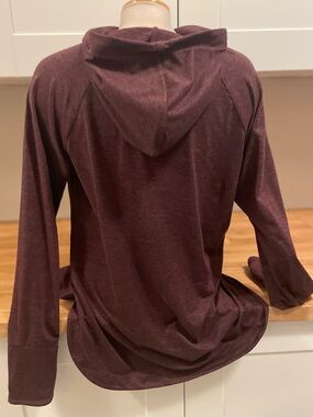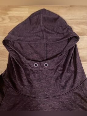 Description - Athleta hooded pullover in maroon heather. Lightweight knit with front grommet details. Casual design for everyday wear. Pullover style with subtle texture.