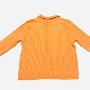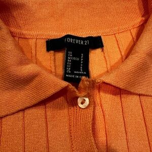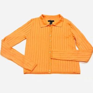 Search Terms: > Forever 21 peach cropped cardigan, ribbed knit button up, pastel orange long sleeve top, preppy collar sweater, y2k aesthetic clothing, women's small spring cardigan, lightweight layering piece, soft girl aesthetic, coquette style knitwear, casual peach top.