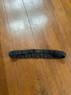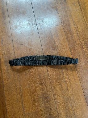 Burberry belt in ruched black leather. Gunmetal plaque clasp with engraved logo. Made in Italy. Sleek, contemporary accessory for layering. Circa 2009-10