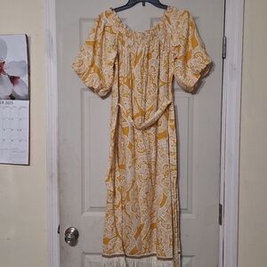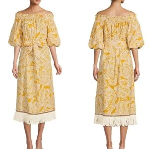 Off-the-Shoulder Printed Linen Blend Tie Waist A-Line Midi Dress