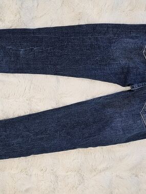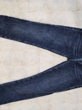 FRAME branded skinny jeans in a deep blue denim. Classic five-pocket style with gold hardware. Clean, versatile look. Soft worn-in finish.