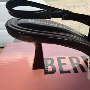 New Berness Calliope02 slingback heels in black patent leather. These pointed-toe shoes feature a decorative bow on the front and a comfortable kitten heel. Size is 8.5 and they come in the original box. Material is all man-made.