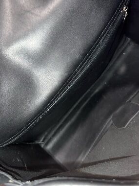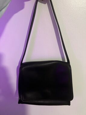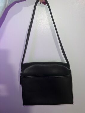 Classic Coach shoulder bag in smooth black leather. Simple flap design with clean lines. Slim adjustable strap for easy wear. Timeless and versatile for day or night.