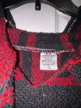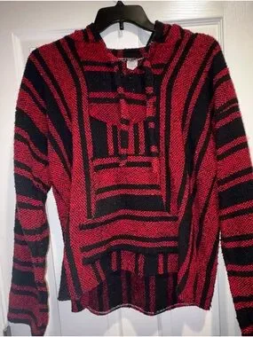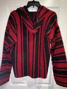 Classic Baja-style knit hoodie. Bold red and black striped pattern. Front kangaroo pocket and hood. Cozy, casual layer with textured weave.